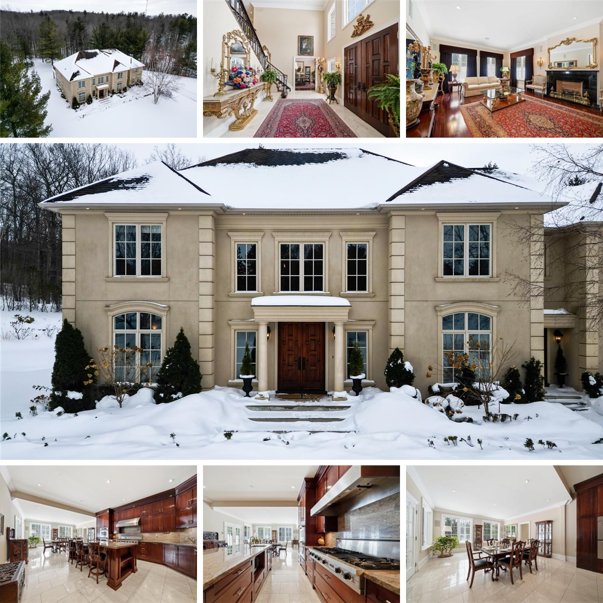 **Grand Interior Highlights:** Marble foyer with **20-ft ceilings** & sweeping staircase Cherry hardwood floors & custom millwork 9-ft walnut doors & oversized windows 500-sq.-ft. gourmet kitchen with **45-sq.-ft. centre island** Granite counters & premium appliances Sun-filled breakfast area with seamless outdoor access